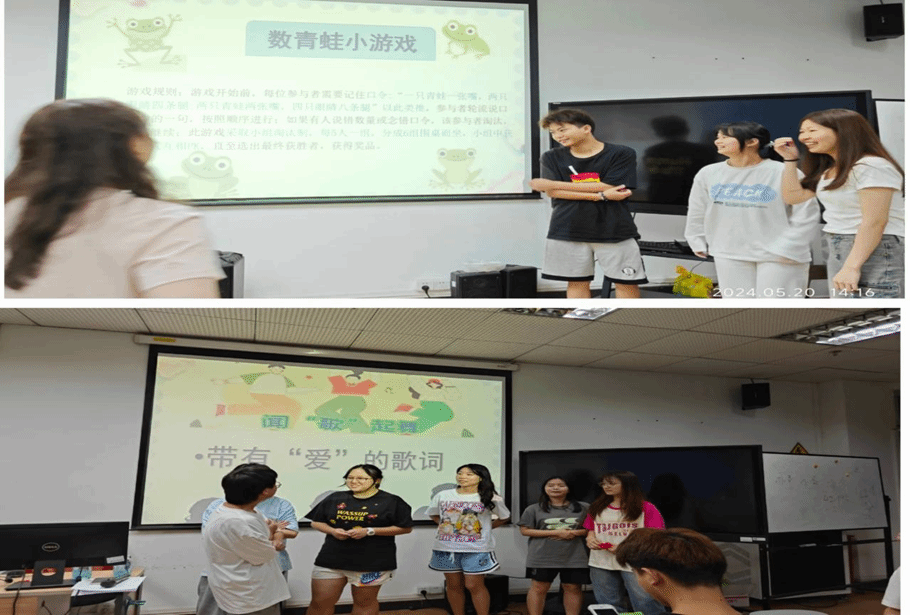 以抽取颜色卡纸的方式分组,接着以“数青蛙”和“闻歌起舞”小游戏引入,使得成员之间的相互了解,建立初步的信任和合作关系。