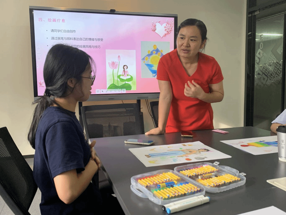在绘画疗愈环节,成员们自由创作,通过画笔与颜料表达自己的情绪与感受。引导者鼓励成员们尝试不同的绘画风格与技巧,让情感在画布上自由流淌。接着成员们依次分享自己的艺术创作过程和感受,以及艺术疗愈带来的情绪变化。