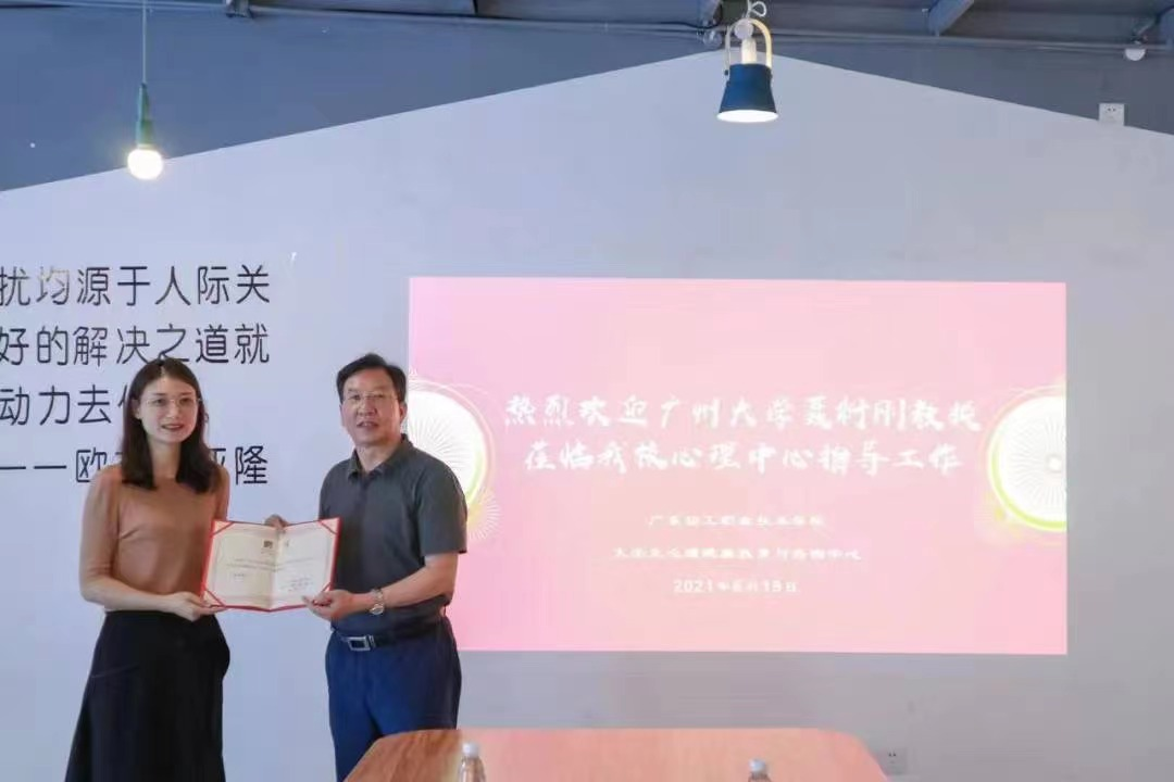 交流指导会议尾声,中心教师王玉洁为聂衍刚教授颁发广东轻工职业技术学院大学生心理健康教育与咨询中心特聘教授聘书。
