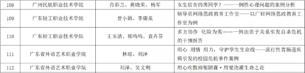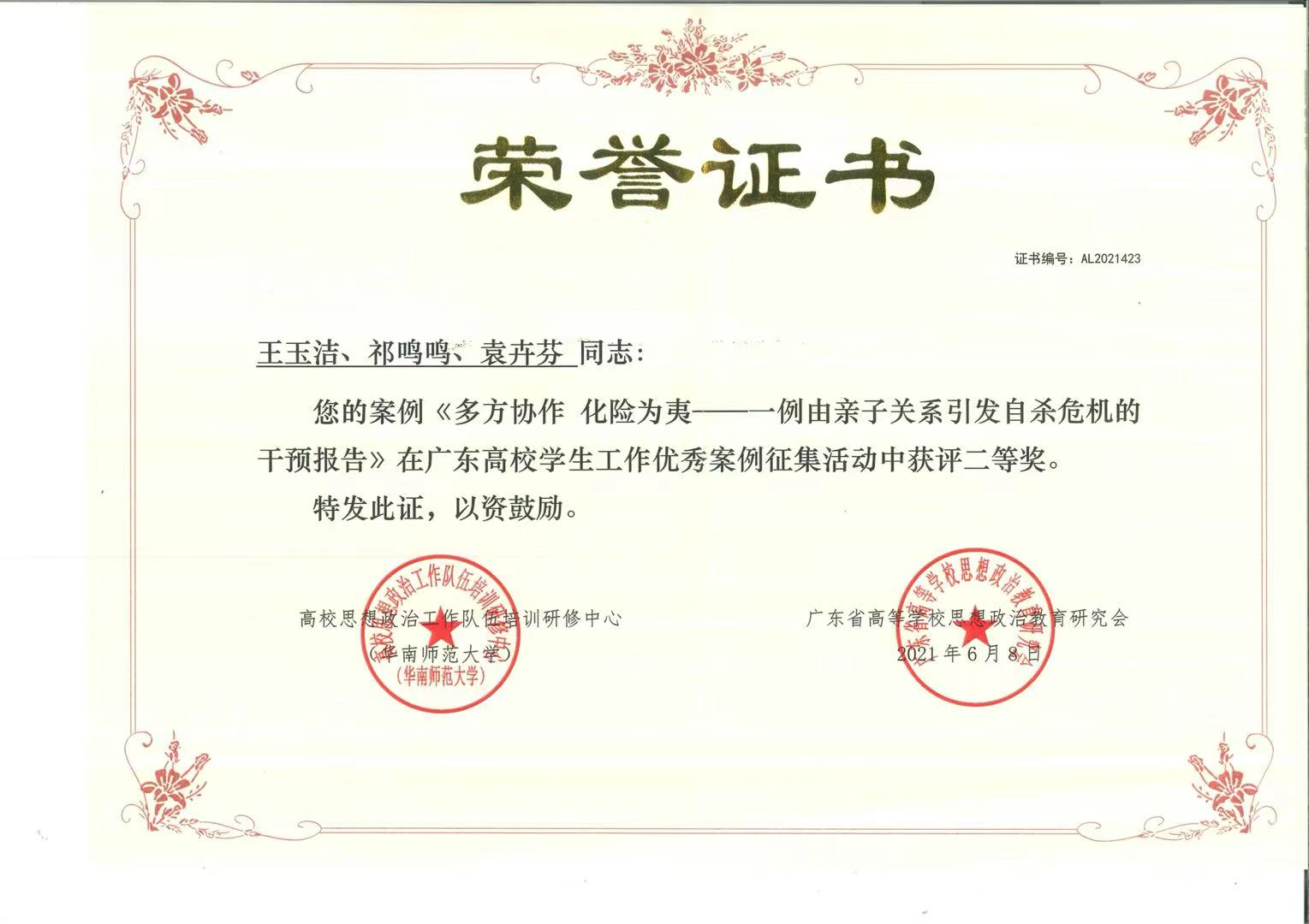 为落实 “三全育人”教育方针,促进高校思想政治工作队伍建设,高校思想政治工作队伍培训研修中心(华南师范大学)、广东省高等学校思想政治教育研究会在我省高校组织开展了思想政治工作实践案例征集及评选活动,收到130所高校提交的1200份工作案例,经过专家评审,我校心理中心老师报送的《多方协作,化险为夷——一例由亲子关系引发自杀危机的干预报告》荣获“广东高校学生工作优秀案例二等奖”。